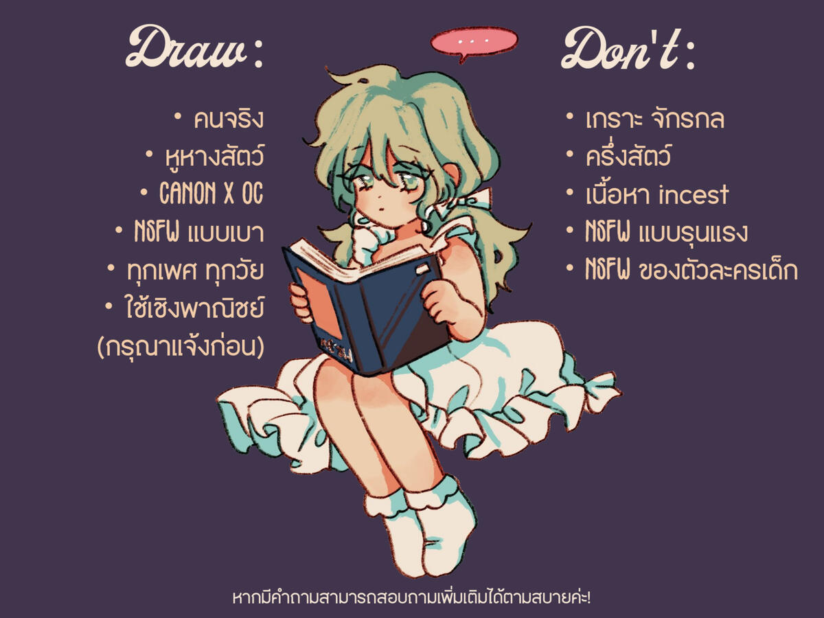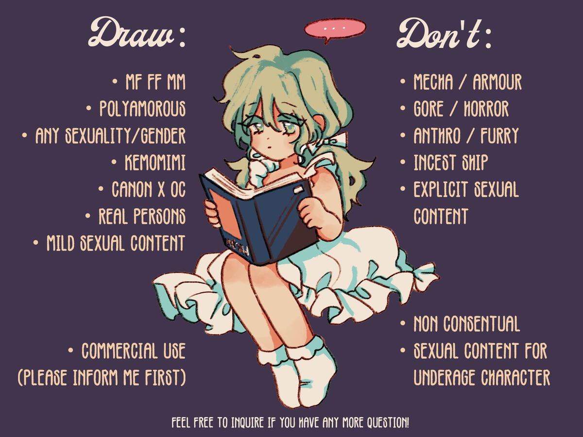 ・เราค่อนข้างไม่สบายใจที่จะทำตามภาพจากศิลปินคนอื่น (ยกเว้นภาพที่คุณไปคอมมิชชั่นมาจากคนอื่นอีกที) สามารถใช้อ้างอิงได้ แต่ไม่สบายใจที่จะคัดลอกท่าทางหรือองค์ประกอบที่เหมือนเปี๊ยบกับภาพอ้างอิงได้ค่ะ